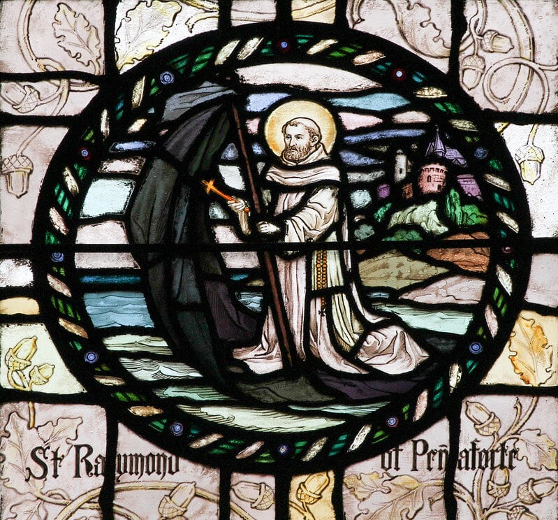 P.S. – Give up on the life event depicted in our stained glass window? St. Raymond was always consulted by King James I of Aragon in every important affair of state. Toward the end of his life, St. Raymond accompanied King James I to an island to obtain the conversion of the Moors. However, King James also brought with him his mistress. St. Raymond reproved the king several times, but to no avail. Refusing to be part of the royal entourage, he began looking for a ship to take him back to the mainland. But, every captain had been forbidden under penalty of death to give him passage. Undaunted, St. Raymond said to his fellow friar, “You will see that the King of Heaven will confound the wickedness of this earthly King and provide me with a ship.”